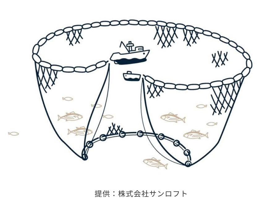 魚群の回りを逃げられないように囲み、網を徐々に狭めて魚を獲る漁法です。
