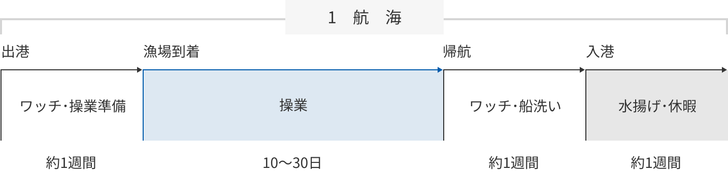 - ●1回の航海(出港から帰港まで)に約1ヵ月半かかります。
