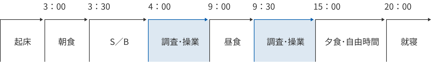 漁場についたら基本的に「ワッチ」と「魚群の探索」、「操業」を行います。「ワッチ」は1日2回実施。1回の「ワッチ」はだいたい3時間程度です。漁場移動の際は網の修理や休日となります。