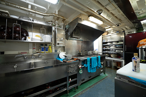 乗組員28人分の食事を作る場所。火は火災の原因となるため電気調理器を使用