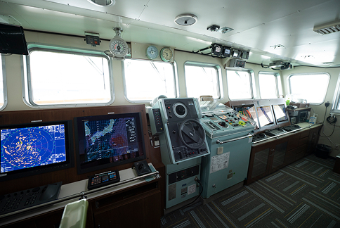 航海士の仕事場。航海計器の他に漁撈に必要なレーダーやソナー、魚探など設置