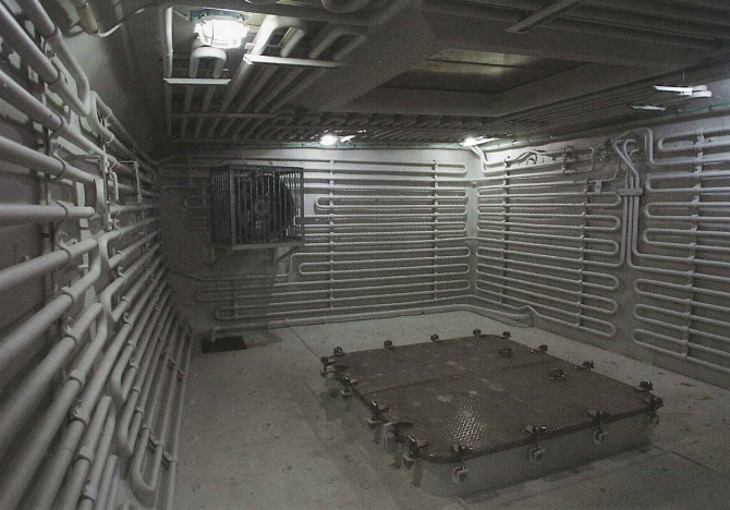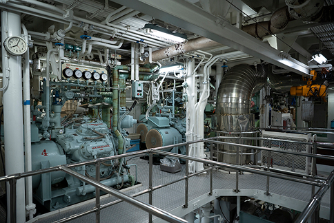 機関士の仕事場。主機1基、補機2基、冷凍機8基が搭載されています。