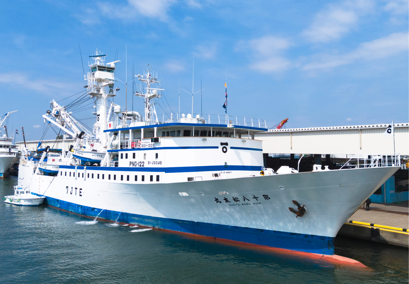 自社船舶である海外まき網漁船「第十八松友丸」は2015年に完成し、現在海外海域にて、カツオ・マグロを漁獲しています。当船は、760トン型という国内最大級の船であり、海外まき網漁業の将来を担う大型まき網船です。設備としては、省エネ・省力化設備や労働・居住環境改善のための最新鋭機器を導入し、燃油の削減・乗組員の労力削減・安全航海が可能です。